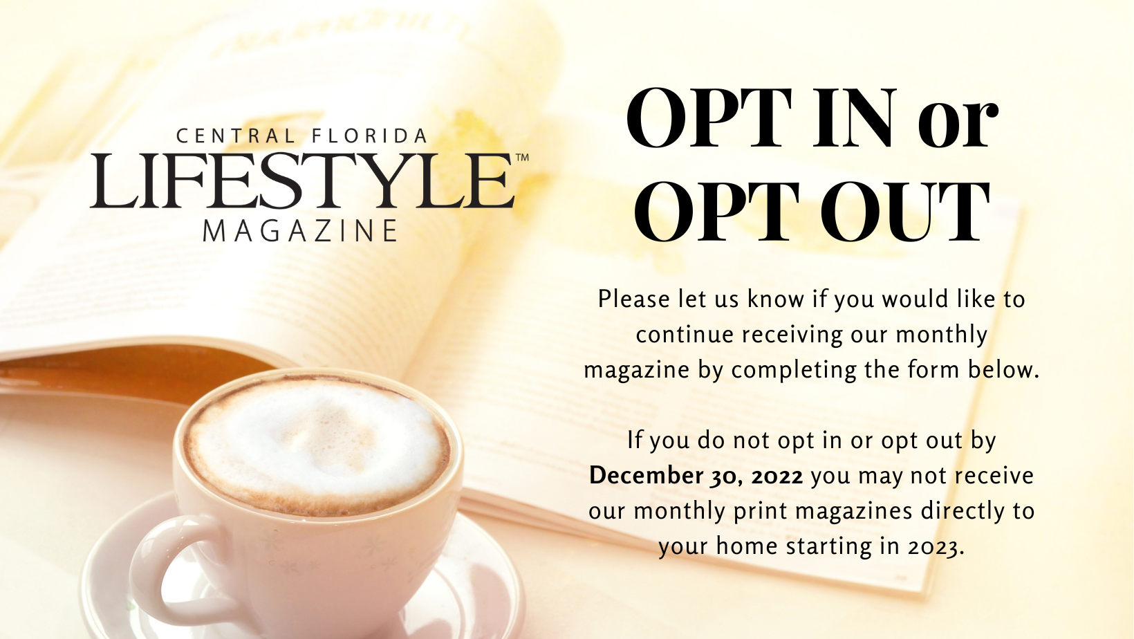 Still Interested? Let us know if you are still interested in receiving the physical copy of the Central Florida Lifestyle Magazine. Opt In or Opt Out(Required)If you do not opt in or opt out by December 30, 2022 you may not receive our monthly print magazines directly to your home starting in 2023. We only mail to Central Florida addresses. Yes – I would like to continue receiving the monthly print magazine directly to my home address in Central Florida.. No – I would like to opt out of receiving the monthly print magazine to my home address. Subscribe to our mailing list(Required)If you want our magazine digitally, you can subscribe to our mailing list to receive our magazine and newsletter straight to your inbox. Yes – I would like to be added to the mailing list No – I do not want to be added to the mailing list Your InformationName(Required) First Last Suffix Address(Required) Street Address Address Line 2 City AlabamaAlaskaAmerican SamoaArizonaArkansasCaliforniaColoradoConnecticutDelawareDistrict of ColumbiaFloridaGeorgiaGuamHawaiiIdahoIllinoisIndianaIowaKansasKentuckyLouisianaMaineMarylandMassachusettsMichiganMinnesotaMississippiMissouriMontanaNebraskaNevadaNew HampshireNew JerseyNew MexicoNew YorkNorth CarolinaNorth DakotaNorthern Mariana IslandsOhioOklahomaOregonPennsylvaniaPuerto RicoRhode IslandSouth CarolinaSouth DakotaTennesseeTexasUtahU.S. Virgin IslandsVermontVirginiaWashingtonWest VirginiaWisconsinWyomingArmed Forces AmericasArmed Forces EuropeArmed Forces Pacific State ZIP Code Email(Required) Δ{{#message}}{{{message}}}{{/message}}{{^message}}Your submission failed. The server responded with {{status_text}} (code {{status_code}}). Please contact the developer of this form processor to improve this message. Learn More{{/message}}{{#message}}{{{message}}}{{/message}}{{^message}}It appears your submission was successful. Even though the server responded OK, it is possible the submission was not processed. Please contact the developer of this form processor to improve this message. Learn More{{/message}}Submitting…